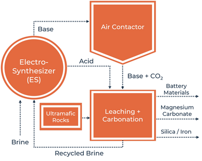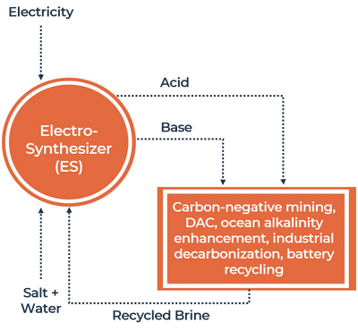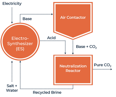 The electrosynthesizer cost effectively makes acid and base to capture CO2 from air and release it as a pure CO2 stream in a fully mass-balanced process with no waste or emissions.